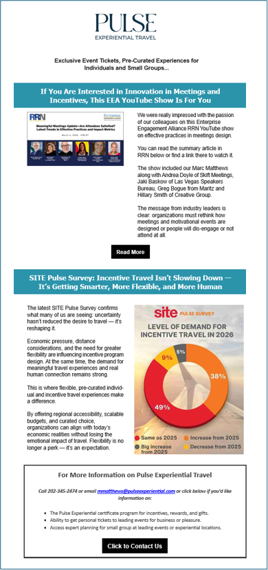 Over time, Pulse Experiential Travel’s communication ecosystem has become more than a marketing tool. It has evolved into what is essentially its own proprietary media platform, an increasingly valuable asset it owns. Through its newsletters and LinkedIn presence, the company communicates directly with thousands of professionals in the incentive travel and corporate engagement ecosystem each month in a highly measurable way.