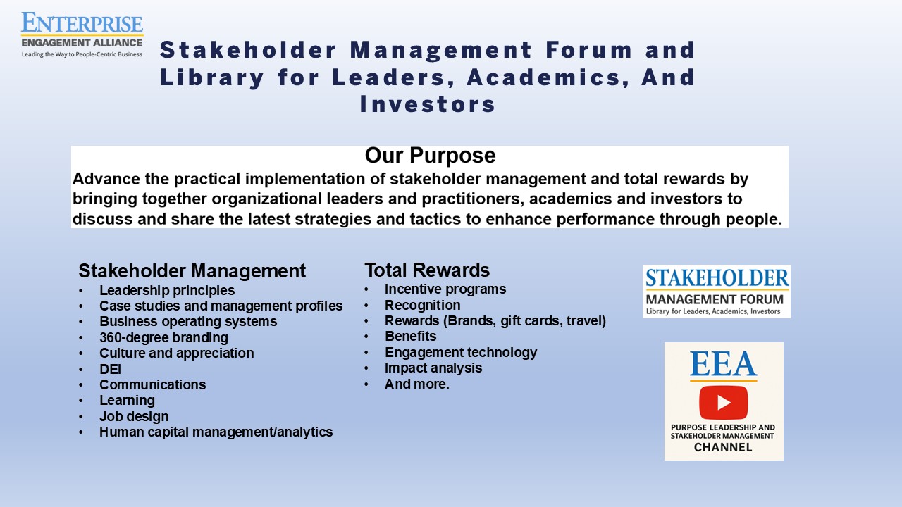 Click on the links below below for academic and other research, EEA YouTube shows, and other resources on stakeholder management, enterprise engagement, and total rewards.