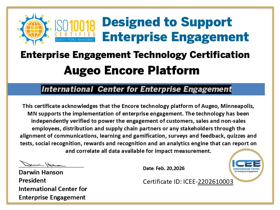 A recent audit of the Augeo Encore enterprise engagement technology confirms that it powers the model for harmonizing the interests of stakeholders across an organization or team. The International Center for Enterprise Engagement at TheICEE.org has renewed the certification for Enterprise Engagement portal technology for ISO 10018 People Engagement standards, following an audit of its capabilities. Augeo is a Minneapolis-based loyalty and engagement company.