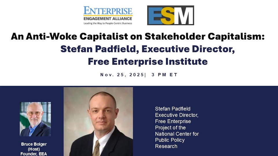 Stefan Padfield—Executive Director of the Free Enterprise Project at the National Center for Public Policy Research, is a staunch proponent of shareholder capitalism. While he sees merit in elements of stakeholder capitalism, the term he says is too tainted to use. Bruce Bolger, Founder of the Enterprise Engagement Alliance, publisher of ESM, argues that stakeholder management is simply a better form of capitalism, that an already ambiguous definition was deliberately turned into a straw man by opponents, and that term shareholder capitalism today has become hopelessly tainted.