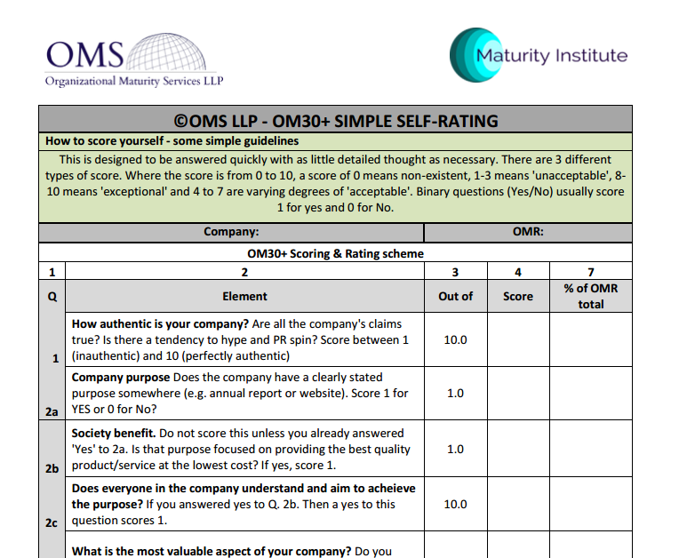 To obtain a copy of the OM30+ spreadsheet for self-scoring your organization, send your details (Name, Organization, Job Title) to Stuart Woollard. An outline pdf copy of the OM30+ is available online. The full working template is available here.