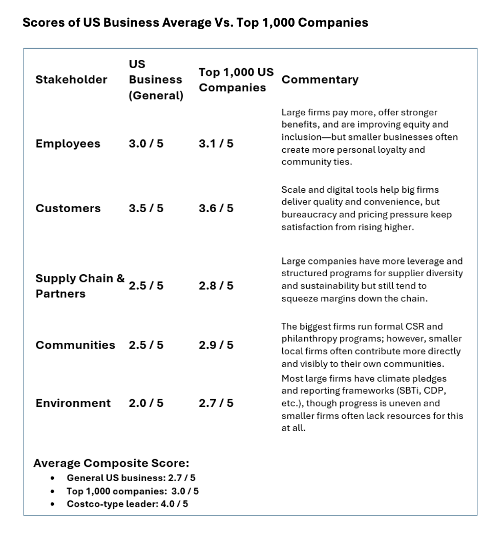 Using Costco as a benchmark, I asked ChatGPT 5 to evaluate the average US business as well as the top 1,000 companies. Both the average company