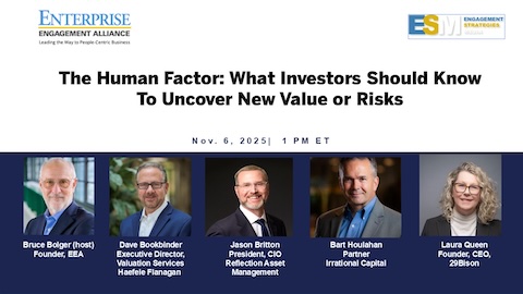 Ask your questions on stakeholder capital metrics to four experts on how the engagement of employees, customers, and other stakeholders signal both opportunities and risks for investors in this live show Nov. 6, at 1 pm ET. As always, it will be posted the following week on the Enterprise Engagement Alliance’s Purpose Leadership and Stakeholder Management YouTube channel and summarized in ESM.