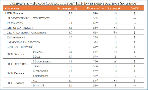 The combined score is translated into a 10-tier rating system from D to A+, with “investment grade” representing the top one-third of organizations whose human-capital profiles historically correlate with stronger risk-adjusted returns. This system allows leaders and investors to evaluate culture with the same rigor as financial metrics and pinpoint where improvements can yield the greatest performance impact.”